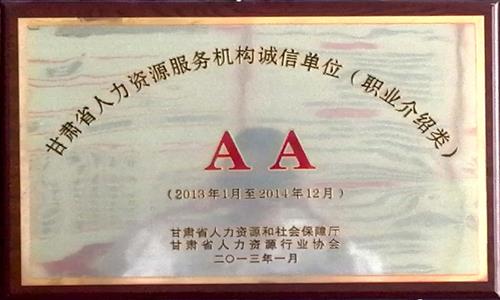2013年2月公司職介所被甘肅省人力資源和社會保障局、甘肅省人力資源行業協會授予“AA級誠信單位”;